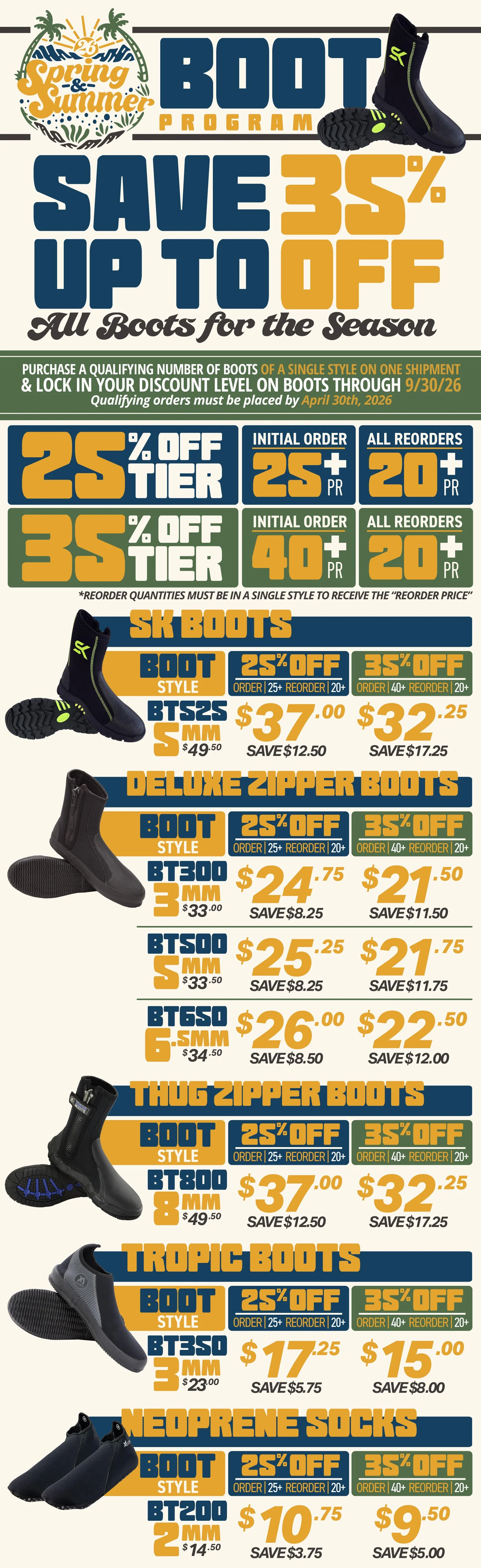 Your qualifying order quantity will determine which tier level you are in for the season. If you would like to guarantee yourself the maximum savings for the season, lock it in with a qualifying order of 40 or more pairs of boots before April 30th, 2026. All reorders of boots, as long as there are 20 or more pairs of the same style on the order, will receive the promotional price through September 30th, 2026.